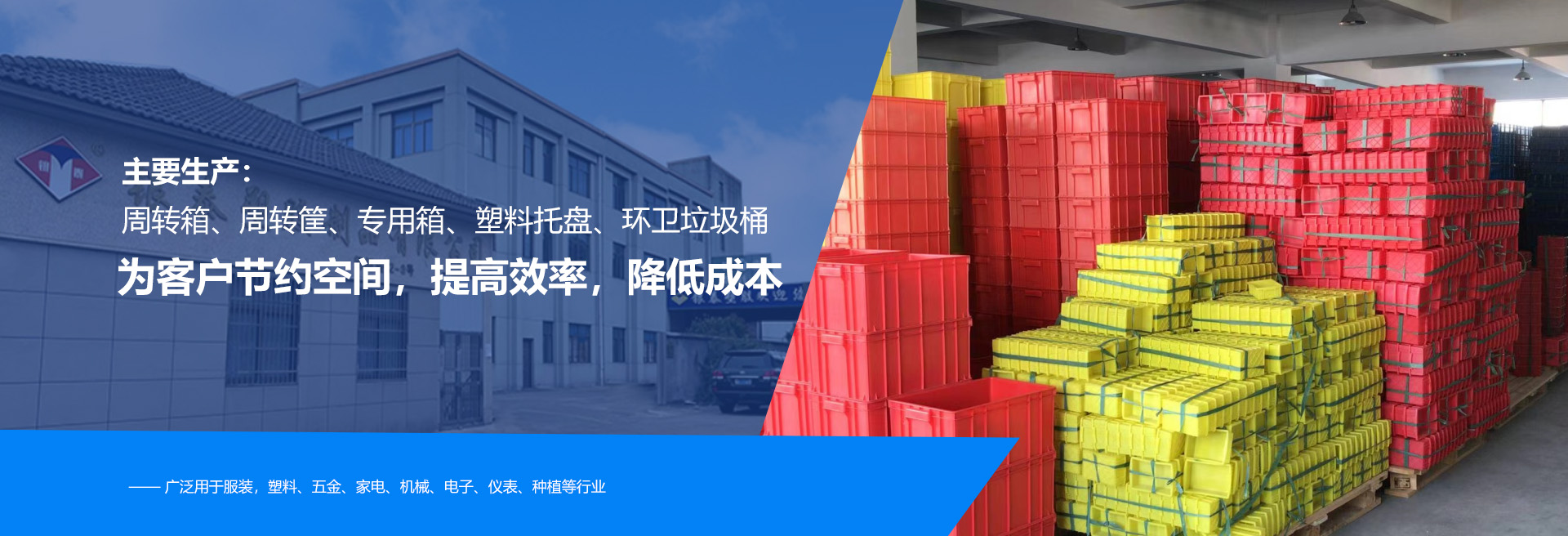 公司經過幾年的發展,公司已形成周轉箱、周轉筐、專用箱、塑料托盤、環衛垃圾桶等幾個系列,并可訂做特殊規格及防靜電產品,廣泛用于服裝,塑料、五金、家電、機械、電子、儀表、種植等行業。本著“為客戶節約空間,提高效率,降低成本”的理念,竭誠為國內外客戶提供更完善的產品和更周到的服務。